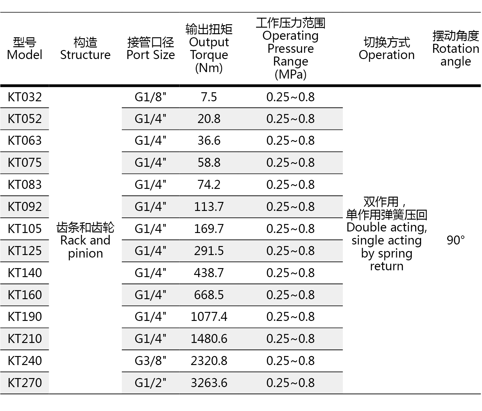注:表格中的输出扭矩为压力为0.5MPa时双作用执行器的输出扭矩